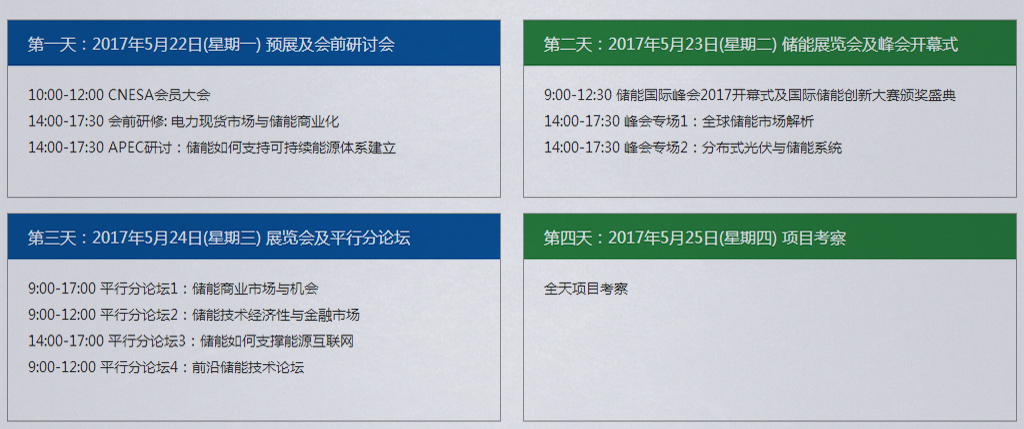 由國家能源局科技裝備司指導,中國能源研究會、中關村管委會支持,中關村儲能產業技術聯盟主辦的第六屆“儲能國際峰會暨展覽會2017”將于2017年5月22-24日在國家會議中心隆重舉行,同期將舉辦國際儲能創新大賽和新品發布會。本次展會將規劃出2000平米展示區,設置100+展位,儲能全產業鏈的領頭企業將集中展示其先進的技術、產品與項目。 [查看詳細]
