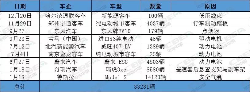 隨著新能源汽車保有量的增加,新能源汽車安全問題也逐漸增多。尤其是今年上半年頻繁的新能源汽車自燃,引發了全社會的廣泛關注。針對新能源汽車安全監管,國家工業和信息化部、國家市場監督管理總局等政府部門紛紛行動,從新能源汽車、動力電池生產制造,到售后召回環節均做了大量工作。據電池中國網了解,截至目前(12月23日),國家市場監督管理總局已要求召回33281輛新能源汽車,涉及企業有特斯拉、北汽新能源、蔚來汽車、寶馬(中國)、奇瑞汽車、鄭州宇通客車、南京金龍客車、哈爾濱通聯客車等9家車企。
