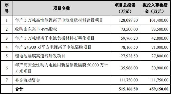 日前,璞泰來發布公告擬募集資金不超過45.9億元,扣除發行費用后將投資于年產5萬噸高性能鋰離子電池負極材料建設項目、收購山東興豐49%股權、年產5萬噸鋰離子電池負極材料石墨化項目、年產24,900萬平方米鋰離子電池隔膜項目、鋰電池隔膜高速線研發項目、年產高安全性動力電池用新型涂覆隔膜50,000萬平方米項目和補充流動資金。