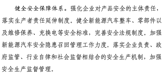 《征求意見稿》提出,強化企業對產品安全的主體責任,落實生產者責任延伸制度。健全新能源汽車整車、零部件以及維修保養、充換電等安全標準,完善安全法規制度。加強新能源汽車安全隱患召回管理工作力度。落實企業負責、政府監管、行業自律和社會監督相結合的安全生產機制,加強安全生產監督管理。