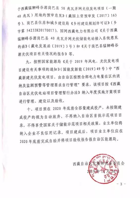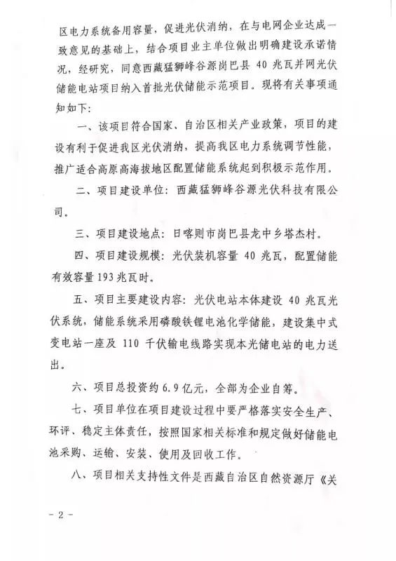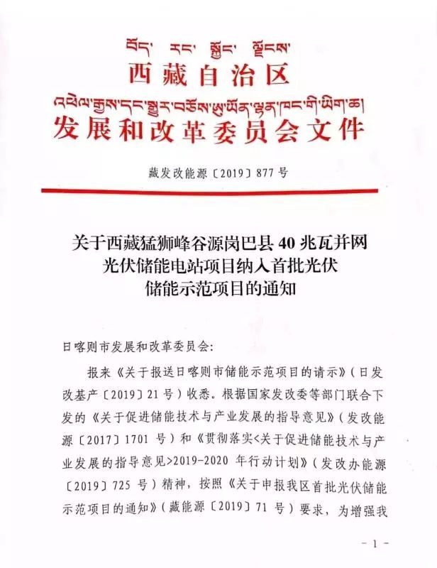 12月26日,西藏自治區(qū)發(fā)展和改革委員會(huì)下發(fā)《關(guān)于西藏猛獅峰谷源崗巴縣40兆瓦并網(wǎng)光伏儲(chǔ)能電站項(xiàng)目納入首批光伏儲(chǔ)能示范項(xiàng)目的通知》(藏發(fā)改能源〔2019〕877號(hào)),批復(fù)同意西藏猛獅峰谷源崗巴縣40MW光伏+193MWh儲(chǔ)能項(xiàng)目納入西藏首批光儲(chǔ)示范項(xiàng)目。文件肯定了西藏猛獅峰谷源崗巴縣40兆瓦并網(wǎng)光伏儲(chǔ)能電站項(xiàng)目推廣高原高海拔地區(qū)儲(chǔ)能系統(tǒng)的積極示范作用。