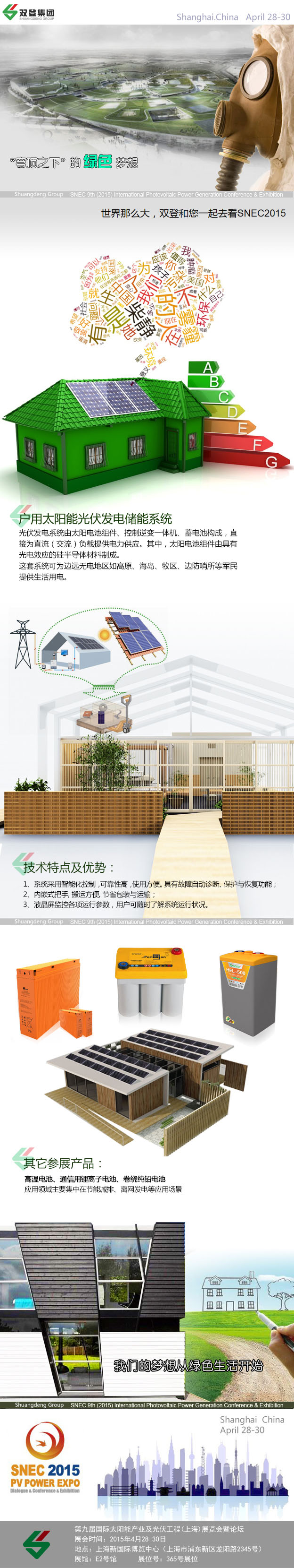 2015年4月28-30日,上海新國際博覽中心即將舉辦SNEC第九屆(2015)國際太陽能產業及光伏工程(上海)展覽會及論壇(SNEC PV POWER EXPO 2015)。定位于“大數據時代領先的綠色儲能集成服務供應商”的雙登集團,將攜多種新能源產品盛裝亮相,與您一起追尋穹頂之下的綠色夢想。