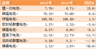 2013年,我國化學電源主要品種出口額同比上年增長3.2%,總計95.8億美元,2012年出口額為92.8億美元。