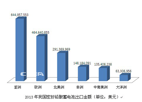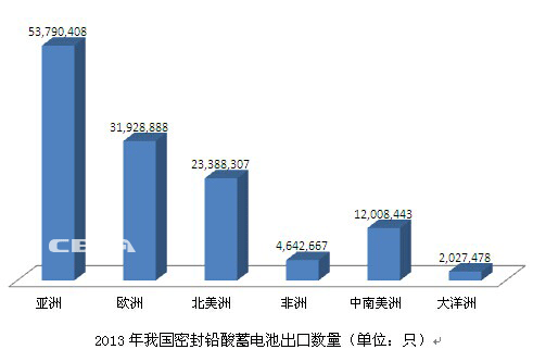 2013年,我國密封鉛酸蓄電池出口額17.48億美元,2012年出口額為17.32億美元,同比增長 0.9%。其中,出口亞洲金額同比增長10.9%,出口歐洲同比減少9.3%,出口北美同比減少10.2%,出口非洲同比增長40.9%,出口中南美洲同比減少2.6%。