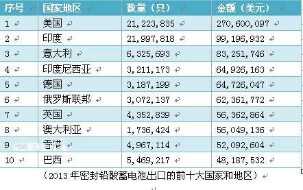 2013年,我國密封鉛酸蓄電池出口的前十大國家和地區(qū)為美國、印度、意大利、印度尼西亞、德國、俄羅斯聯(lián)邦、英國、澳大利亞、香港、巴西。其中,我國密封鉛酸蓄電池向印度出口量最多,達到21,997,818只,向美國出口金額最高,達到270,600,097美元。