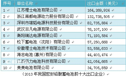 2013年,江蘇理士電池有限公司的密封鉛酸蓄電池出口金額最高,達到了164,269,924美元,浙江南都電源動力股份有限公司出口金額緊隨其后,達到了132,738,505美元。2013年,我國密封鉛酸蓄電池的前十大出口企業(yè)總計出口金額達到759,018,296美元。