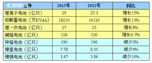 2013年,我國電池行業總體發展較為平穩。以鋰離子電池為代表的新型電池發展迅猛;鉛酸蓄電池發展呈穩健上升趨勢;鋅錳電池產量稍降;鎳鎘電池、鎳氫電池和堿錳電池產量降幅較大。