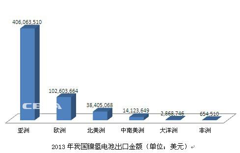 據(jù)中國化學(xué)與物理電源行業(yè)協(xié)會發(fā)布的《2013年我國電池產(chǎn)業(yè)出口數(shù)據(jù)》,2013年我國鎳氫電池的出口量為6.27億只,2012年出口量為6.9億只,同比減少9.1%。2013年,我國鎳氫電池出口額為5.64億美元,而2012年出口額為6.51億美元,同比減少13.4%。其中,出口亞洲金額同比減少14.2%,出口歐洲金額同比減少8.6%,出口北美金額同比減少19.7%。出口中南美洲金額同比減少2.5%。