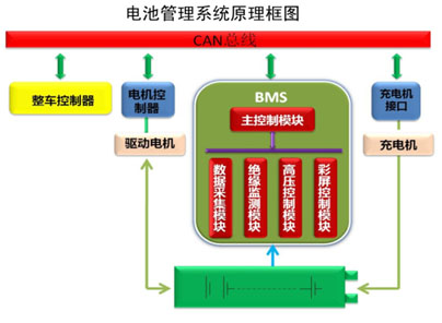 參照電池管理系統(tǒng)(BMS)原理框圖,中間綠色部分是BMS主控制模塊,包括數(shù)據(jù)采集模塊,絕緣檢測(cè)模塊,高壓控制模塊,彩屏控制模塊。中控制模塊只是一個(gè)檢測(cè)單元,并不等同于BMS。完整的BMS所起的作用包括與整車控制器、電機(jī)控制器、充電機(jī)接口、驅(qū)動(dòng)電機(jī)、充電機(jī)相結(jié)合。