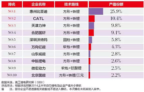 整體而言,全球鋰電行業以中、日、韓為主導的格局已經成形。未來,隨著我國鋰電資源儲備優勢、制造成本優勢和市場規模優勢的進一步發揮,比亞迪、比克、力神、光宇等一批鋰電企業快速成長,中國在全球鋰電市場占有率也不斷提升。目前國內動力電池制造企業“第一陣營”如下:
