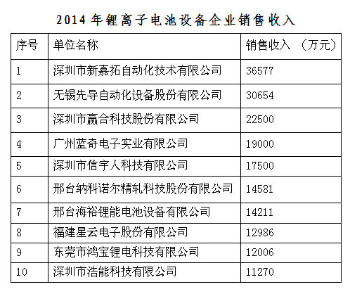 據(jù)悉,本次評(píng)選以2014年度參評(píng)企業(yè)產(chǎn)品銷售收入為主要依據(jù),并參考利潤(rùn)總額、出口創(chuàng)匯額等其他經(jīng)濟(jì)指標(biāo)綜合排定,“2014年鋰離子電池設(shè)備企業(yè)銷售收入排名”也同期發(fā)布。