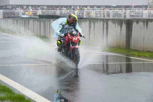 作為本年度的首場比賽,各路車隊有足夠的時間備戰(zhàn)。怎奈天公不美,2號上午下起大雨來,使得原本10點開始的練習(xí)賽推遲了半小時,早已整裝待發(fā)的眾車手隨著裁判一聲哨響,如脫僵野馬般沖入賽道。由于賽道積水,沖在最前面的車手賽車打滑,摔倒在地,人車前后相繼滑出十米遠(yuǎn),激起一幕水墻,車手在人群的驚呼聲中扶起摩托,揚長而去,留下一串水花和一個瀟灑的背影,觀眾轉(zhuǎn)而歡呼鼓掌相送。后來,車手們索性任性的玩起水來,大有比賽看誰水花濺得高濺得帥之勢。