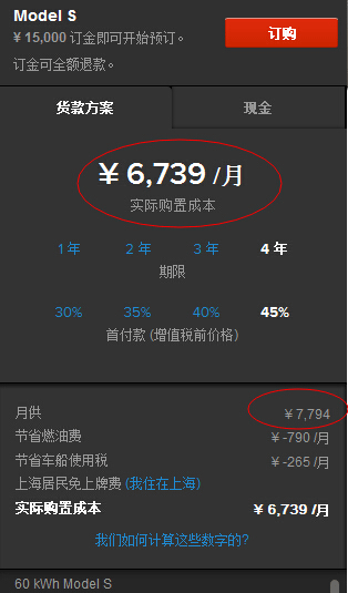 值得一提的是,特斯拉官網(wǎng)此次弱化了實際月供的顯示,而是突出了實際購置成本。以Model S 60千瓦時版本為例,按上述最少月供來計算,月供為7425元,然而特斯拉官網(wǎng)網(wǎng)頁上著重強調了6739元的使用成本,該數(shù)字為月供金額扣除燃油費及車船使用稅之后的金額。