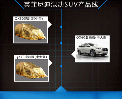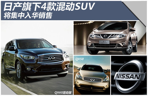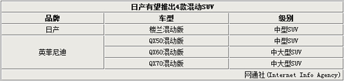 日產(chǎn)汽車此前計(jì)劃在2016年將推15款混動(dòng)車型,該計(jì)劃將涉及到日產(chǎn)和英菲尼迪兩大品牌。日產(chǎn)負(fù)責(zé)全球產(chǎn)品業(yè)務(wù)的執(zhí)行副總裁Andy Palmer曾表示:為了避免同已經(jīng)占領(lǐng)市場的歐洲豪車直接競爭,英菲尼迪將采用差異化策略,打造一系列混合動(dòng)力車型,包括注重運(yùn)動(dòng)性能的轎車、轎跑和跨界SUV等。未來,日產(chǎn)旗下混動(dòng)SUV車型將增至4款。英菲尼迪中國事業(yè)部總經(jīng)理戴雷在接受采訪時(shí)曾表示:混合動(dòng)力是我們未來發(fā)展的一大重點(diǎn),會(huì)有多款使用此技術(shù)的新車型推出。除已確認(rèn)的QX60混動(dòng)版今年將在華上市外,其他三款SUV均有望入華銷售。