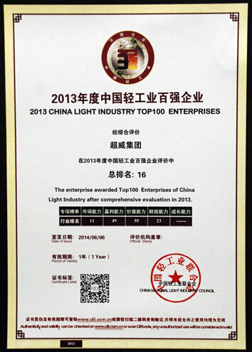 超威集團在2013年度中國輕工業百強企業評價中總排名第16位