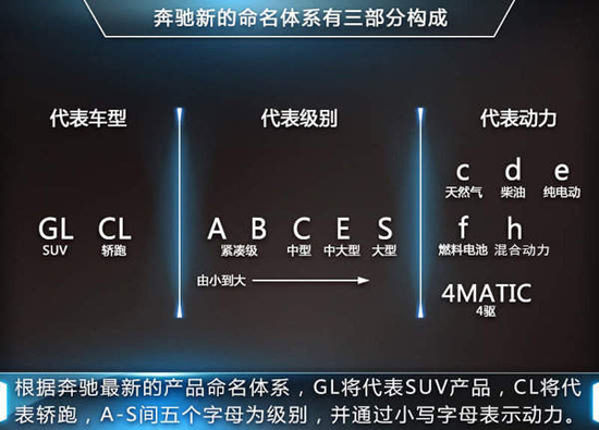 另外由于奔馳此前正式公布了全新的命名體系,旗下所有車系均將由1-3個大寫字母組成,并將圍繞著目前轎車產(chǎn)品序列中的A級、B級、C級、E級和S級,在一定程度保留原始命名的同時,以字母組合的形式體現(xiàn)不同級別的產(chǎn)品。而因采用特殊的動力系統(tǒng),所以新能源車型也有特殊的尾綴標(biāo)識,插電混動和純電動車型則加入字母“e”,HYBRID混動車型則加入字母“h”。