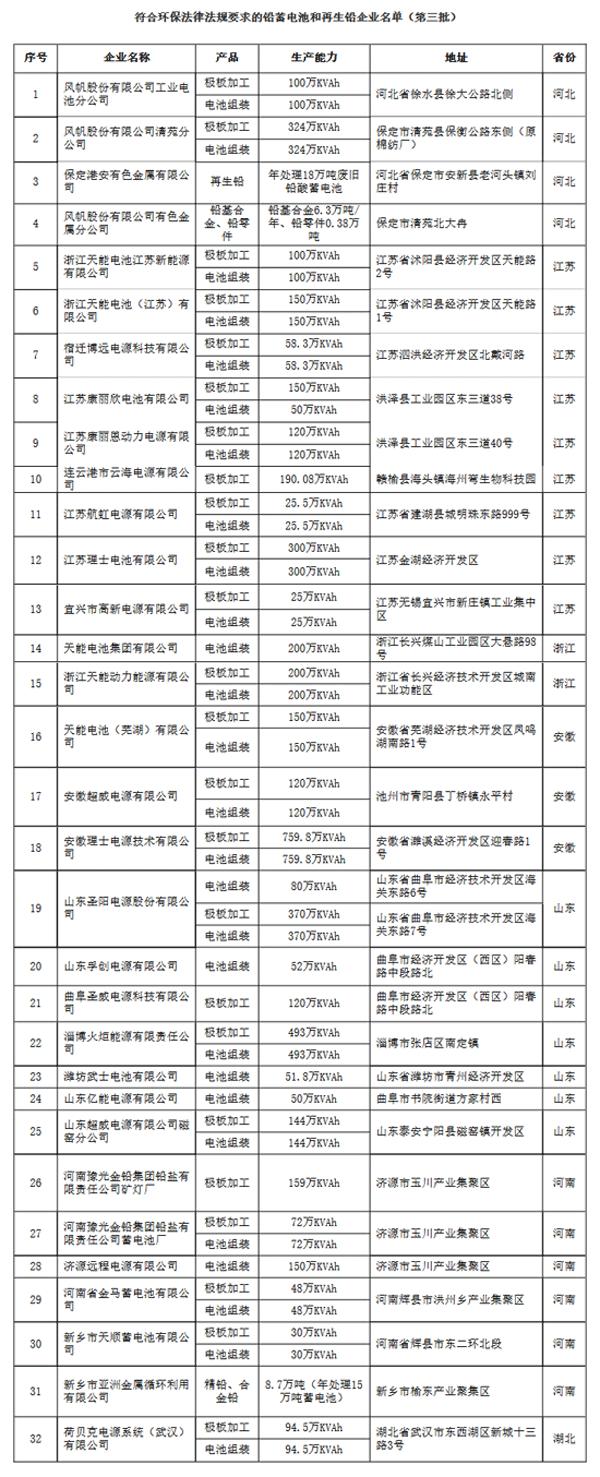 為確保公眾身體健康,提升污染防治水平,我部開展了鉛蓄電池和再生鉛企業(yè)環(huán)保核查工作。經(jīng)企業(yè)自查、省級(jí)環(huán)保部門初審、專家資料審查,第三批共有32家鉛蓄電池和再生鉛企業(yè)基本符合環(huán)保法律法規(guī)要求。