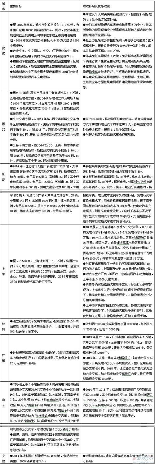2014年,財政部、科技部、工信部、發(fā)改委(以下簡稱四部委)聯(lián)合發(fā)布新能源汽車補(bǔ)貼標(biāo)準(zhǔn)調(diào)整計劃,并于同期公布第二批新能源汽車推廣應(yīng)用城市名單,全國共有12個區(qū)域的26個城市入圍。隨后,多個省市密集發(fā)布新能源汽車補(bǔ)貼政策細(xì)則,包括新能源汽車推廣目標(biāo)、充換電等基礎(chǔ)設(shè)施建設(shè)規(guī)劃、新能源汽車補(bǔ)貼標(biāo)準(zhǔn)及相關(guān)優(yōu)惠政策等。本文將以商用車為主線,以表格形式對各地關(guān)于新能源政策進(jìn)行了匯總。