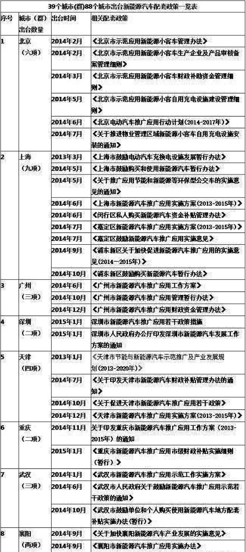 以下為39個(gè)城市(群)88個(gè)城市新能源汽車(chē)配套政策一覽表