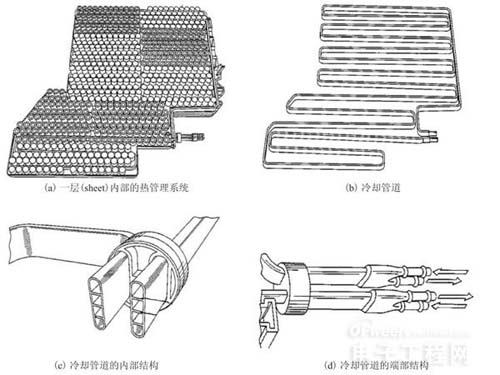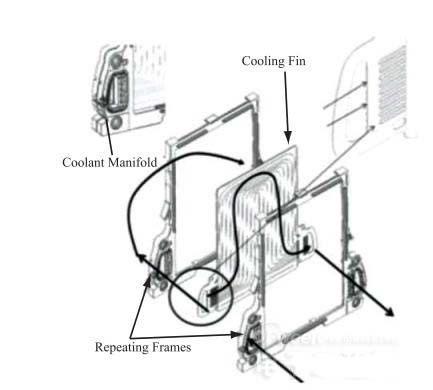 通用汽車公司的Volt插電式混合動力汽車使用了288節45 Ah的層疊式鋰離子電池。電池組的電氣連接可等效為96片單體串聯成組,3組并聯。熱管理系統采用了液冷式設計方案,以50%水與50%乙二醇混合物為冷卻介質。單體電池間間隔布置了金屬散熱片(厚度為1 mm),散熱片上刻有流道槽。冷卻液可在流道槽內流動帶走熱量。在低溫環境下,加熱線圈可以加熱冷卻液使電池升溫。