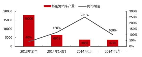 根據中國汽車工業協會的數據,2013年國內共銷售新能源汽車約1.8萬輛,同比增長超過40%,全年銷量已經超過2009年至2012年新能源汽車累計銷量。而2014年以來,我國新能源汽車產銷量繼續提速,一季度生產新能源汽車6651輛,同比增長120%,4月份產量3850輛,同比增長251%,5月份產量3770量,同比增長接近100%。1-5月份我國新能源汽車產量合計為1.4萬輛,已經接近2013年全年產量。