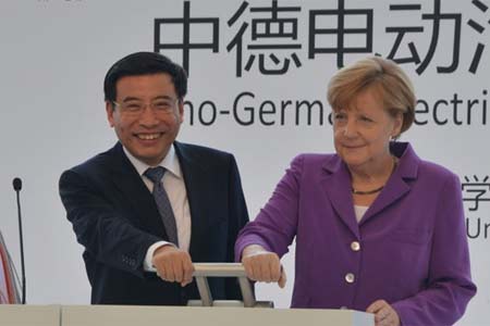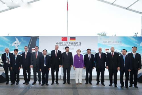 為這些電動車接通電力、注入能量的是德國總理默克爾和中國工信部部長苗圩。7月8日上午,清華大學主樓門前,中德電動汽車充電項目發布儀式在此舉行。默克爾和苗圩到場參加儀式,分別就電動汽車中德合作發表了看法,最后聯手拉下開關,為上述八輛電動汽車打開了充電開關。