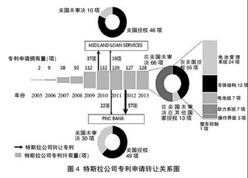 埃倫·馬斯克宣布特斯拉公司將開放所有專利技術(shù),那么特斯拉公司真正擁有多少專利呢?筆者對特斯拉公司的專利權(quán)屬轉(zhuǎn)讓情況進(jìn)行了深入檢索統(tǒng)計(jì)分析,發(fā)現(xiàn)近年來特斯拉公司對所持有專利進(jìn)行了很多專利權(quán)轉(zhuǎn)讓。如圖4中所示,從INCOPAT數(shù)據(jù)庫獲知,在2010年至2012年間,特斯拉公司名下的271項(xiàng)專利申請中有超過135項(xiàng)發(fā)生過專利權(quán)屬轉(zhuǎn)讓(assignment),其中79項(xiàng)轉(zhuǎn)讓給了PNC銀行協(xié)會(PNC BANK,NATIONAL ASSOCIATION),56項(xiàng)轉(zhuǎn)讓給了米德蘭貸款服務(wù)公司(MIDLAND LOAN SERVICES,INC.),并且有20項(xiàng)專利申請涉及兩次權(quán)利轉(zhuǎn)讓,都是先轉(zhuǎn)給米德蘭貸款服務(wù)公司,再轉(zhuǎn)讓給了PNC銀行協(xié)會。
