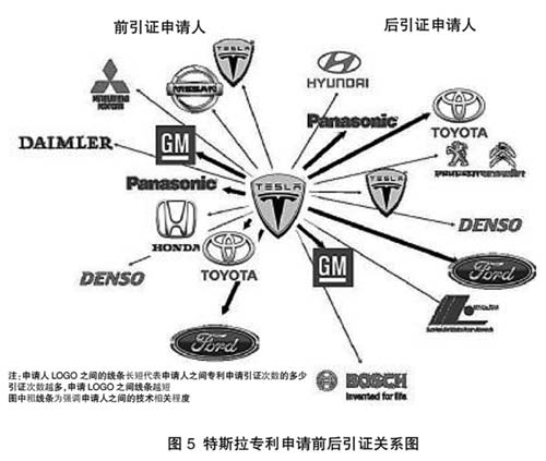 筆者又繼續(xù)對特斯拉公司與電動汽車相關(guān)企業(yè)的技術(shù)關(guān)聯(lián)性進(jìn)行了研究。將特斯拉公司所持有的美國專利進(jìn)行引證和被引證分析后,得出了如圖5所示的特斯拉專利申請前后引證關(guān)系圖。