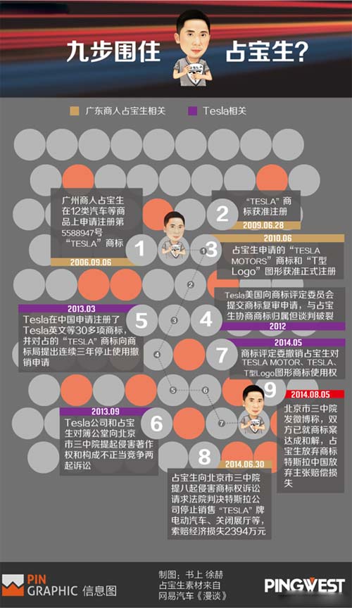 2011年以來,特斯拉一直竭力解決它在中國的商標(biāo)權(quán)問題。而在經(jīng)過起訴、庭審等一系列拉鋸戰(zhàn)后,特斯拉終于贏得了與占寶生關(guān)于商標(biāo)、著作權(quán)、不正當(dāng)競爭等一系列知識產(chǎn)權(quán)的案件。PingWest的信息圖帶你回顧,特斯拉是如何一步步圍住中國商人的。