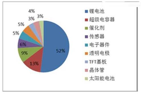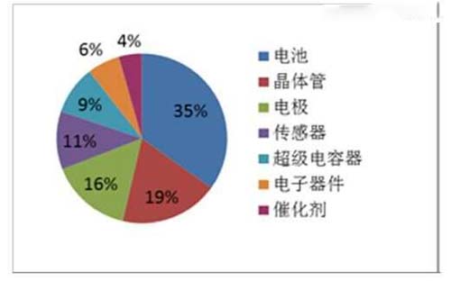 這是來自北京國之專利預警咨詢中心的數據,從專利應用分布可以看出,有鋰電(動力電池)、超級電容器、微電子、觸摸屏、催化劑、太陽能電池等。先看鋰電沒有大的突破。圖3.