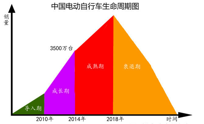再次,拐點期后,電動自行車品牌格局初定。觀察行業生命周期圖,2018年前后中國電動自行車行業將進入真正意義上的成熟期,品牌將大幅度減少,如上文所述,成熟期的品牌數量將大幅度減少,一線品牌陣營擴大,一大批中小企業將不復存在。按照“二八法則”的理論。一線品牌的總銷量均將能突破200萬臺。