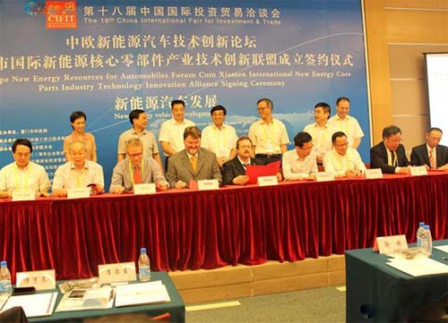 第18屆中國國際投資貿易洽談會(下稱投洽會),于2014年9月8日-11日在福建廈門舉辦。投洽會期間,中歐企業為班底的廈門市國際新能源核心零部件產業技術創新聯盟成立,簽約儀式于9月9日下午舉行。由此,國內首個由企業自發形成的新能源汽車核心零部件產業的跨國聯盟正式成立,也標志這中德新能源汽車合作項目從政府意向層面真正進入企業操作層面。