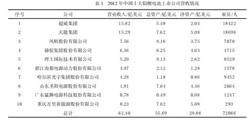 中國的鉛酸蓄電池產業市場分布狀況是,起動電池產量7495萬kVAh,動力電池5320萬kVAh,工業用電池1601萬kVAh。所占總體比例分別是:52%、37%和11%(2012年統計數據)。2011年,受國家環境整治風暴影響,對鉛酸電池行業進行了大洗牌,其結果是加速行業整合,利好于那些規模較大、管理規范的龍頭企業。政府通過環境大整治,樹立了行業新標桿,達到優勝劣汰,促進行業規范化發展,也使行業內企業規模和數量發生巨大變化。《鉛蓄電池行業準入條件》實施以后,全國鉛酸蓄電池企業80%被關停并轉,企業數量從3000多家下降到約500家。從規模結構上看,2011年整治以前,大、中、小型企業所占比例分別是12%、30%和58%,到2013年分別為38%、44%、18%(大型企業指年產值10億以上的企業;中性企業指年產值1~10億元的企業;小型企業指年產值1億以下的企業)。2012年鉛酸蓄電池行業受到下游汽車、電動自行車和摩托車等市場穩定增長的影響,全年產量增長達到12%左右,其中密封鉛酸蓄電池出口量為1.32億只,增長12%,出口額17.32億美元。起動鉛酸蓄電池出口量2096萬只,增長39.3%,出口額3.78億美元。2012年全國鉛酸蓄電池總產量為16120萬kVAh,銷售收入達到1080億元。根據上市企業銷售收入,2012年排名全國前十位鉛酸電池生產企業的營收情況見表1。