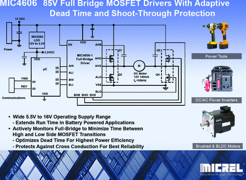 [摘要]日期,瑞半導體公司推出一款 85V 全橋 MOSFET 驅動器 MIC4606,該驅動器具有自適應停滯時間和擊穿保護功能。