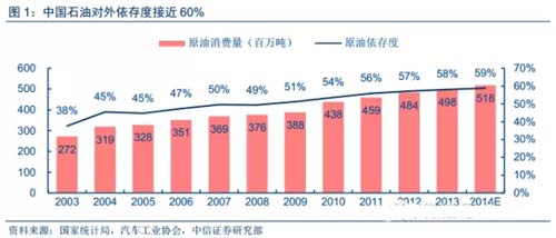 中國原油還能讓汽車業(yè)“奔跑”多久?一邊是中國60%的原油對外依存度,一邊是快速增長的汽車保有量和居高不下的平均油耗。中國已連續(xù)5年成為全球第一大汽車消費國,假設單車油耗不變,到2018年,中國汽車保有量和車用原油量再翻一倍,中國原油對外依存度或超過70%!中國能源結(jié)構(gòu)多煤少油,新能源汽車可降低石油消耗,但考慮到其偏低的銷量占比和普及速度,仍不足以改變中國車用能源結(jié)構(gòu)。