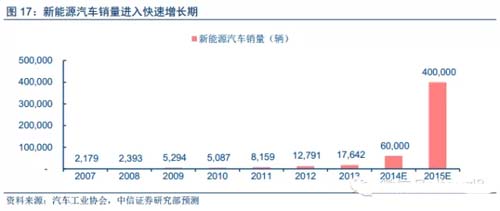 新能源汽車進入銷量快速增長期,預計2014/15年銷量分別達到6萬輛/40萬輛量級,完成50萬輛推廣目標。我們認為,受益于:1)外部推廣政策力度的不斷加強;2)自身產品可靠性、新品投放速度快速提升等兩重因素的共同驅動,新能源汽車的銷量進入快速增長期,預計2014年、2015年的銷量分別達到6萬輛、40萬輛的量級(2013年:1.7萬輛)。