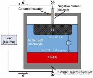 最近刊登在英國《自然》雜志上的一篇文章描述了該電池的結構。它由鋰—銻—鉛電池由液態鋰金屬負極、熔鹽電解液和液態銻鉛合金陽極共同組成。這三種金屬因密度不同而自身形成三個分界明顯的熔鹽層,相鄰熔鹽和金屬相之間互不相融。該電池并沒有采用任何濾膜或隔板。