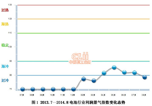 2014年8月利潤景氣指數為78.54,與7月81.80下降3.26百分點,在保持4個月“漸冷”提示區后,重入“過冷”提示區。(參見圖1)
