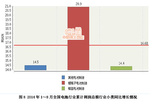2014年1~8月,全國電池行業累計完成利潤總額同比增長16.68%。其中:8月份完成利潤總額12.86億元,同比下降6.75%。