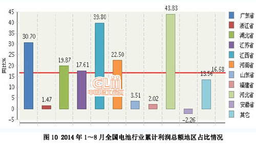 2014年1~8月全國電池行業利潤較高的產區主要集中在廣東、浙江、湖北、江西、江蘇、河南、山東、福建、河北、安徽地區,10 個地區完成利潤總額占全國的92.29%。(參見圖9)
