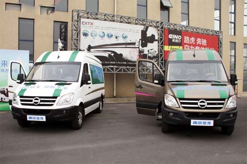 南京金龍的商務(wù)車(chē),左側(cè)是純電動(dòng)版,右側(cè)是傳統(tǒng)燃油版。