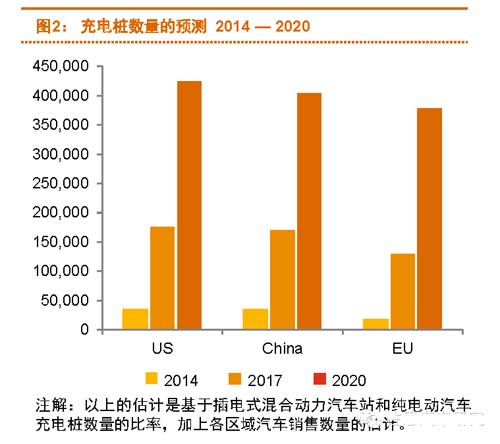 根據普華永道的預測,截至2020年,美國充電樁數量在430000根左右,中國大概會在400,000根左右,歐洲的充電樁數量會在380,000根左右。