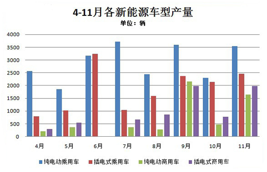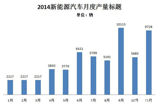 12月3日工信部裝備工業(yè)司發(fā)布數(shù)據(jù)顯示,根據(jù)機(jī)動(dòng)車整車出廠合格證統(tǒng)計(jì),2014年11月,我國(guó)新能源汽車生產(chǎn)9728輛,同比增長(zhǎng)10倍。其中,純電動(dòng)乘用車生產(chǎn)3540輛,插電式混合動(dòng)力乘用車生產(chǎn)2469輛;純電動(dòng)商用車生產(chǎn)1640輛,同比增長(zhǎng)14倍,插電式混合動(dòng)力商用車生產(chǎn)1977輛,同比增長(zhǎng)41倍。列入《免征車輛購置稅的新能源汽車車型目錄》前兩批的新能源汽車生產(chǎn)7932輛,占11月產(chǎn)量的81.5%。