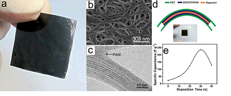 圖3 (a)超薄碳納米管/聚苯胺異質結構薄膜的光學照片;(b)SEM圖像和(c)TEM圖像;(d)柔性透明碳納米管超級電容器的示意圖及光學照片;(e)沉積聚苯胺不同時間碳納米管/聚苯胺薄膜超級電容器電極的質量比電容。