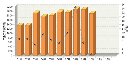 根據(jù)國(guó)家統(tǒng)計(jì)局公布數(shù)據(jù),2014年1~10月全國(guó)鉛酸蓄電池行業(yè)累計(jì)完成產(chǎn)量18,740.30萬(wàn)千伏安時(shí),同比增長(zhǎng)10.00%。其中:10月份完成產(chǎn)量1904.61萬(wàn)千伏安時(shí),同比增長(zhǎng)2.55%。2014年全國(guó)鉛酸蓄電池行業(yè)月度產(chǎn)量及同比如下圖所示。