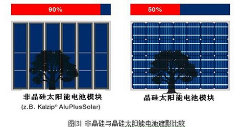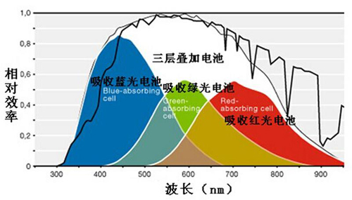 柔性非晶硅太陽能電池中嵌有三層硅晶體,粘附在不銹鋼薄膜上,外覆醋酸乙烯乙烷聚合物(EVA)保護層。三層膜粘合可減薄每個子電子層的厚度,使每個子電池的內電場增加,增加了各子電池的收集效率,擴展了光譜相應范圍。每一層硅晶體都能轉換可見光譜中的特定部分,從而即使在陰雨、多云天氣中也可提供較高的光電轉換率,彌補了非晶硅相對于多晶硅,單晶硅板在晴好天氣轉換率低的不足(晶體硅電池轉換效率在17%左右,非晶硅電池約為8-10%,轉換效率高主要體現在產品可節省一定受光面積,而總體功率不變)。