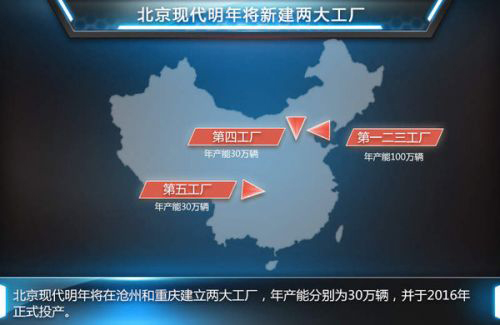 今年,北京現代將銷量目標設定在了110萬輛。不過,產能不足成為了北京現代進一步擴張的瓶頸。目前,北京現代三座工廠均位于北京順義,其中一二工廠總產能60萬輛,第三工廠產能為40萬輛。即便三座工廠馬力全開,產能也僅為110萬輛。2016年兩座新工廠的投產,將為北京現代帶來更大的提升空間。