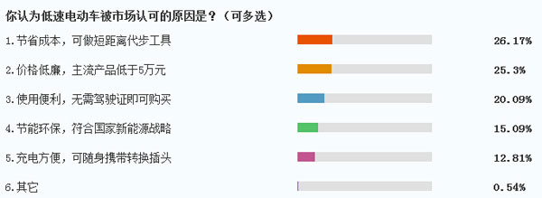 調(diào)查數(shù)據(jù)顯示,有26.17%的網(wǎng)友認(rèn)為低速電動車普遍受到市場歡迎主要是因為在使用過程中可以“節(jié)省成本,并作為短距離代步工具”,這同時也是消費者對于低速電動車最基本的訴求。其次,有25.3%的網(wǎng)友選擇了“價格低廉,主流產(chǎn)品低于5萬元”這一選項,這基本上也符合低速電動車這一細(xì)分市場的定位。