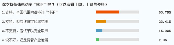 對于這一爭議話題,參與調(diào)查的77.17%的網(wǎng)友都對于低速電動車“轉(zhuǎn)正”表示了支持,其中53.76%的網(wǎng)友更是認(rèn)為應(yīng)該在全國范圍內(nèi)將低速電動車“扶正”,充分滿足市場的需求。