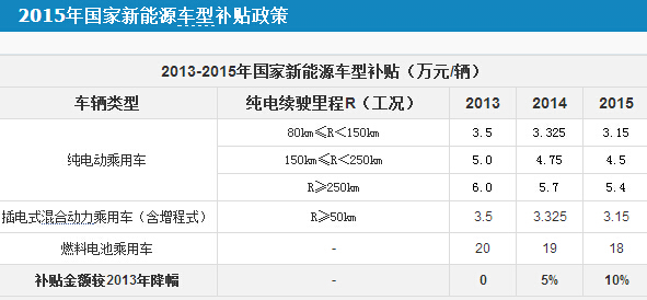2015年,我國新能源車的國家補貼金額將比去年進一步減少。根據2014年2月8日國家發改委等部門聯合發布的《關于進一步做好新能源汽車推廣應用工作的通知》,2015年的補貼金額相比2013年將降低10%。